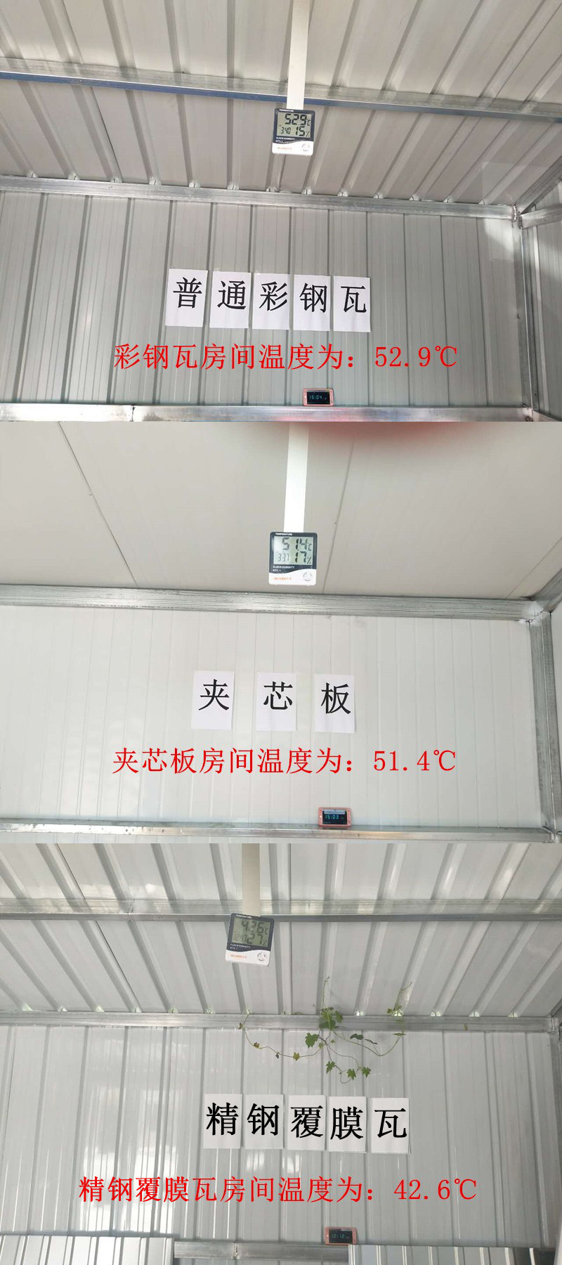 我們從圖中可以看到,普通彩鋼瓦和夾芯板房間的隔熱性能并不好,而精鋼覆膜瓦房間溫度比夾芯板以及彩鋼瓦房間溫度要低,小編在拍照過程中進入彩鋼瓦和夾芯板房間就感覺悶熱難當,精鋼覆膜瓦房間就感覺更加涼爽宜人。
