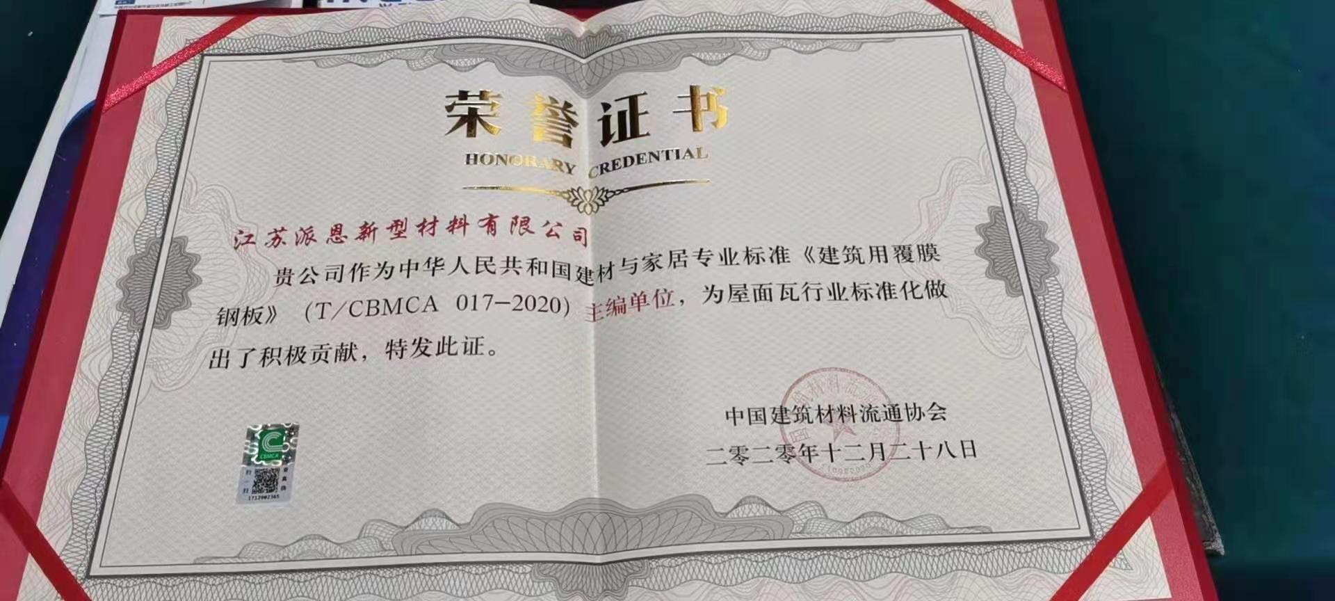 2020年12月28日,江蘇派恩新型材料有限公司喜迎佳音,被中國建筑材料流通協(xié)會人作為中華人民共和國建材與家居專業(yè)標準“建筑瓦覆膜鋼板”(T/CBMCA 017-2020)主編單位,近日,公司已收到證書。