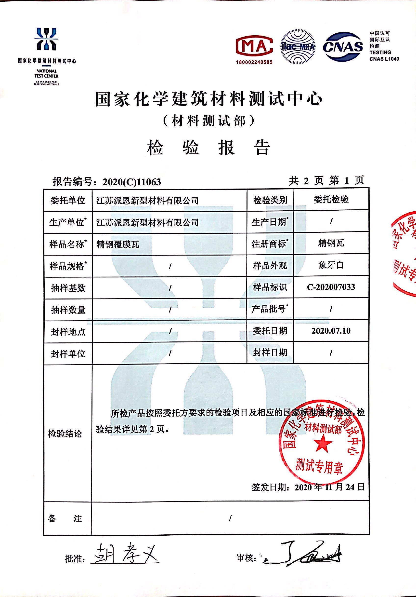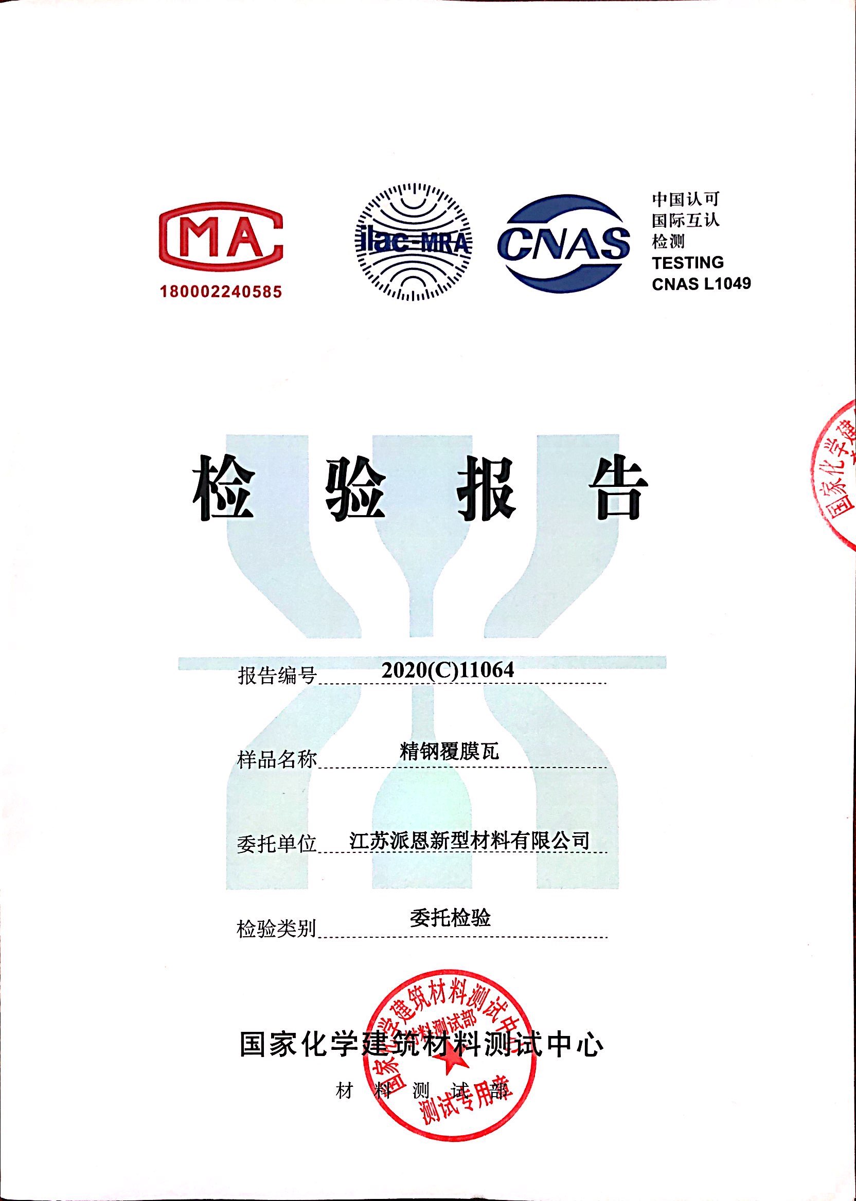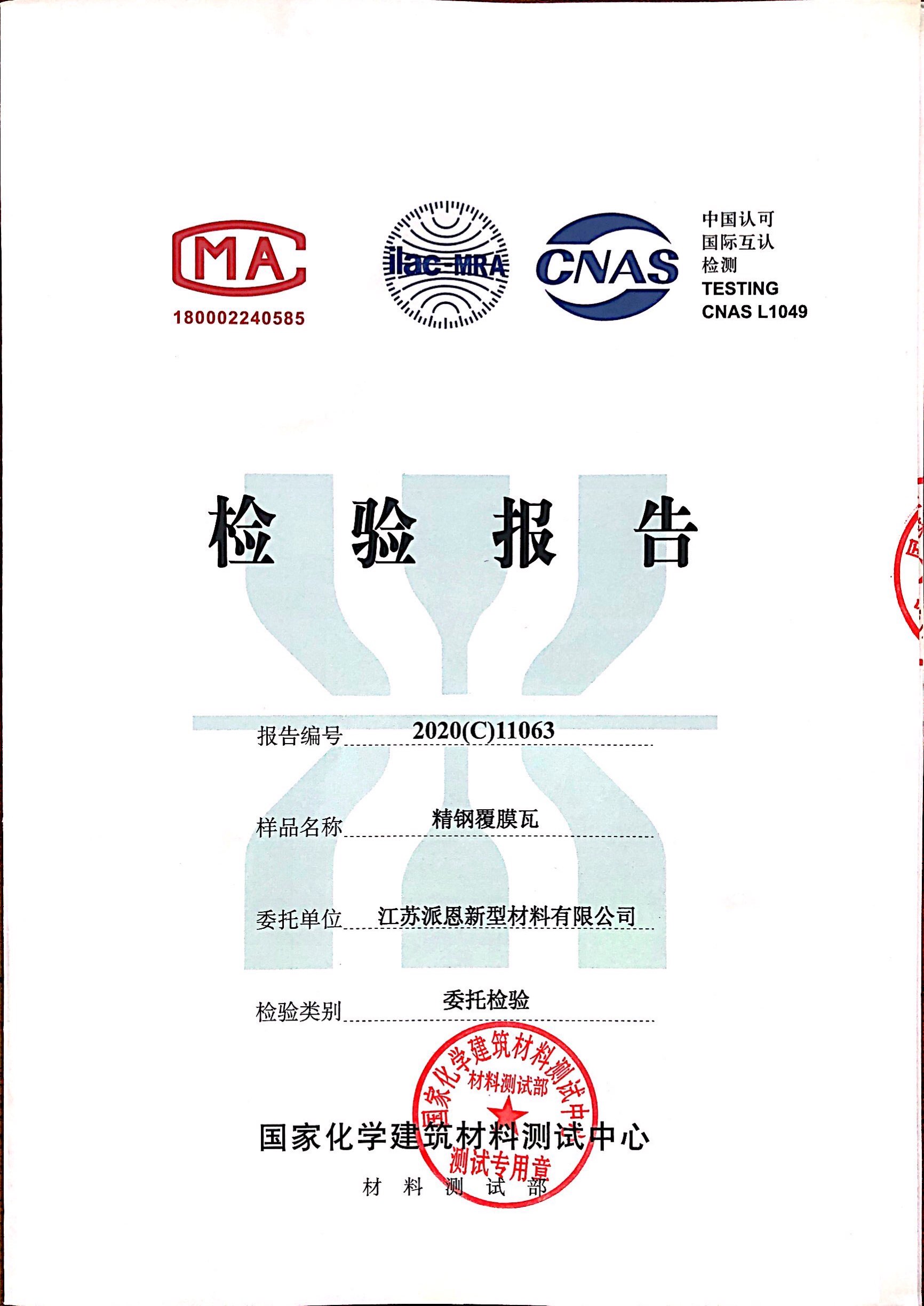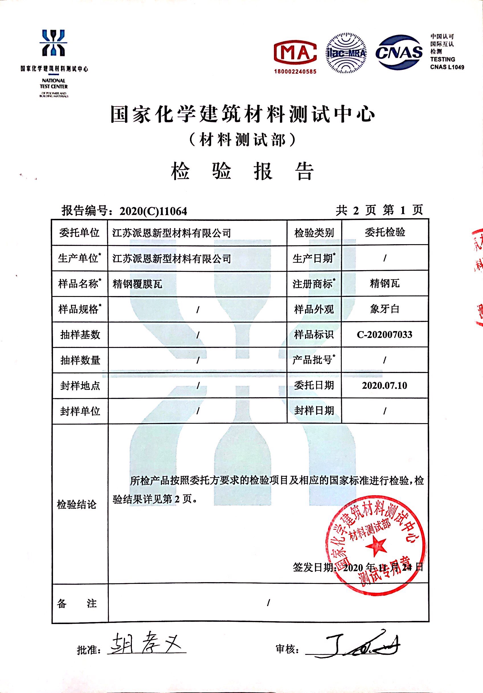 他來啦,他來啦!精鋼覆膜瓦的最新檢測報告來啦!