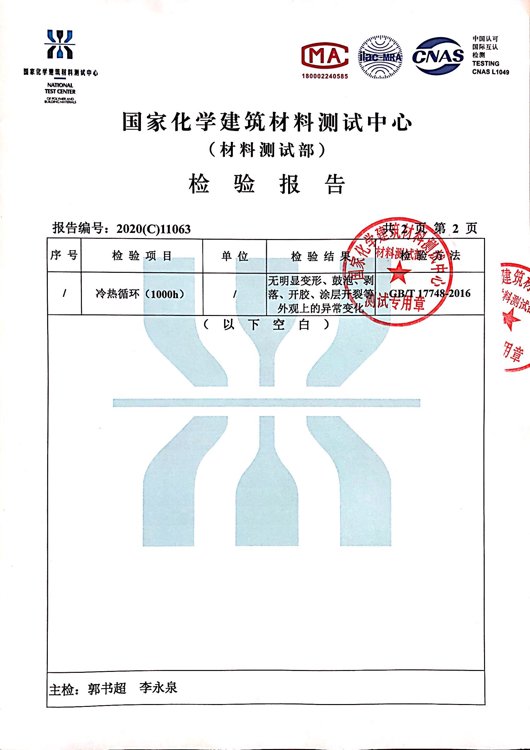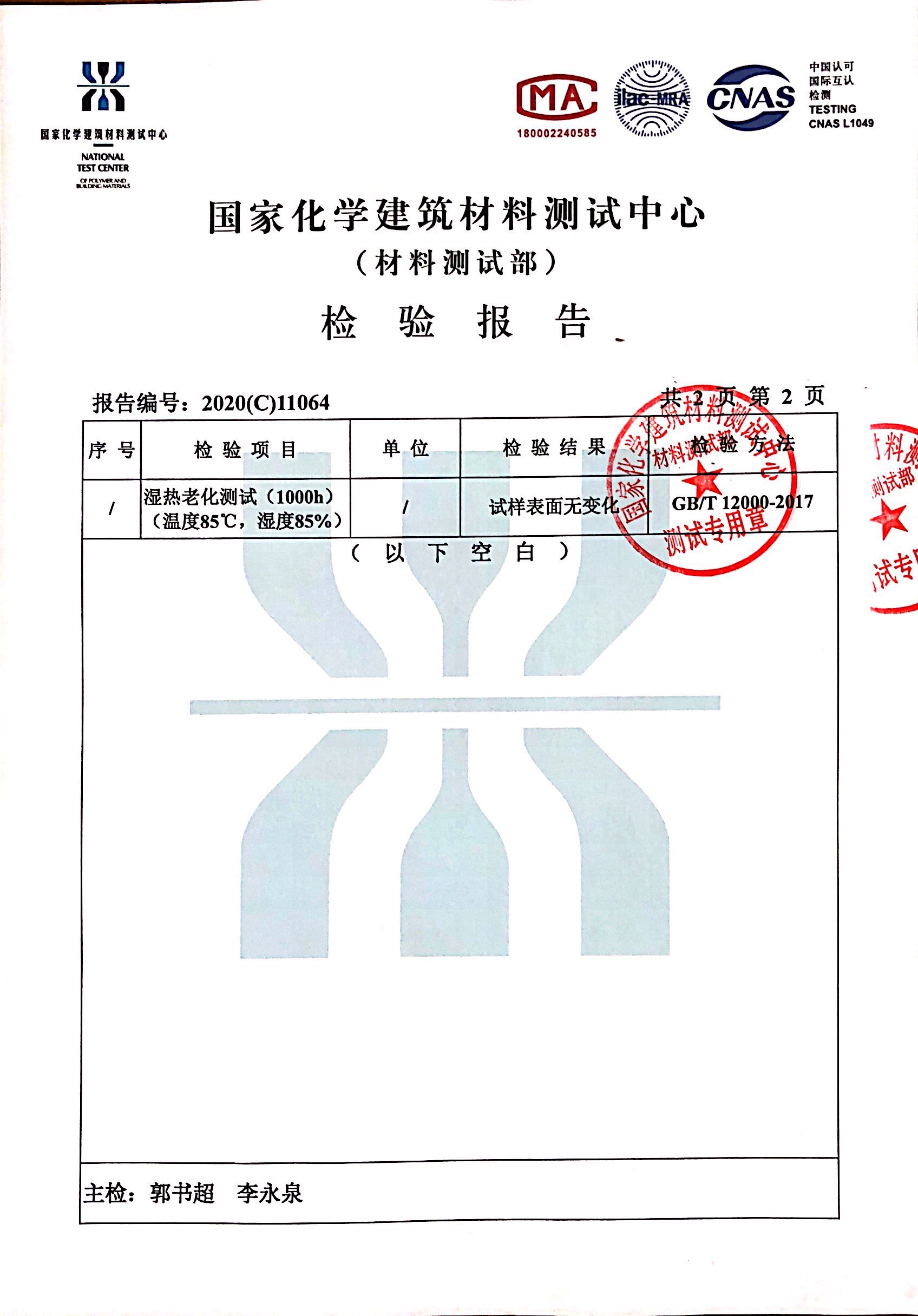 近日,我們收到了來自國家化學(xué)建筑材料中心寄來的檢測報告。